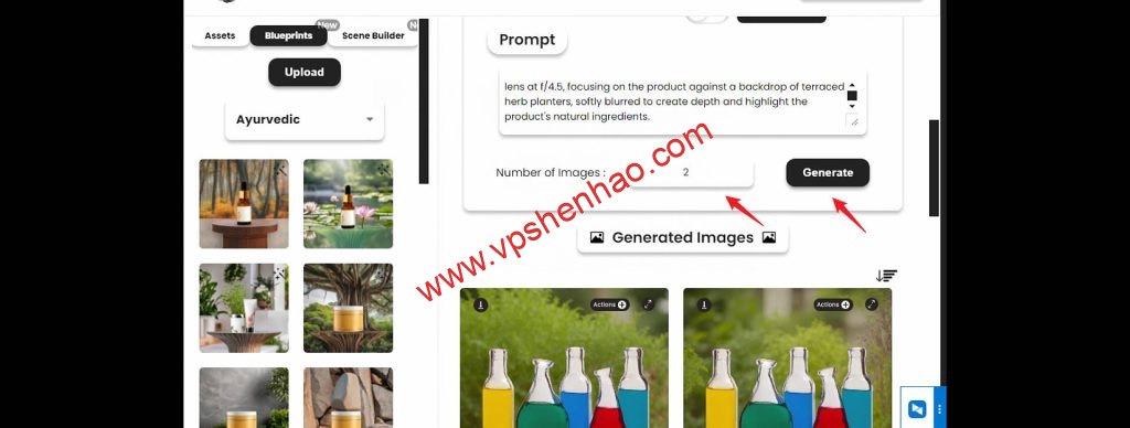 点击场景生成器里已展示好的产品场景图,产品提示词框里将会展示产品场景图生成的提示词,可修改产品提示词框里的提示词,输入图片数量,点击产生,就会生成真实的产品场景图