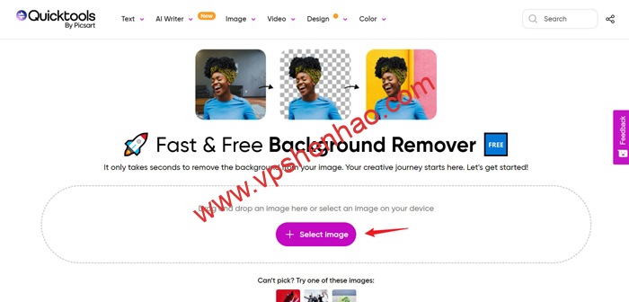 1.浏览器输入网址 Picsart AI去背景图 点击Select image上传要去背景的图片
