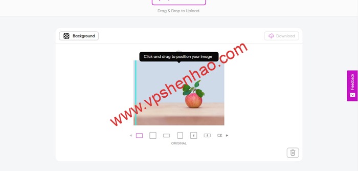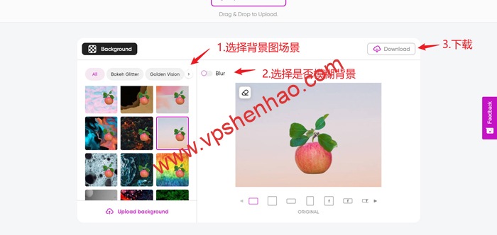 3.选择好系统默认的背景图场景,网站附带自动背景模糊处理功能,根据需求选择是否模糊背景,将实物移动到背景的合适位置,适当缩放实物实现完美展示,最后添加下载按钮完成图片处理