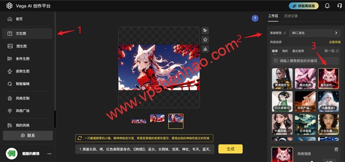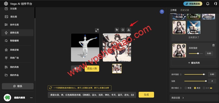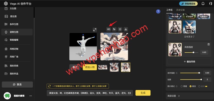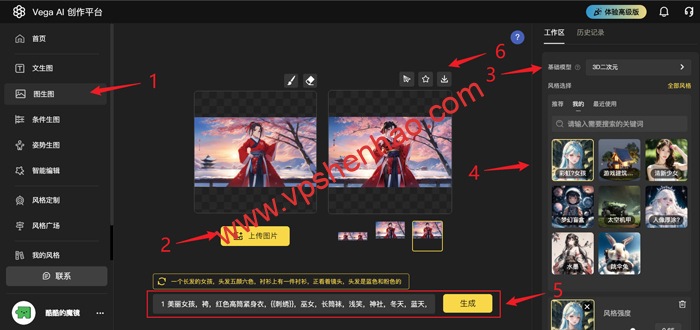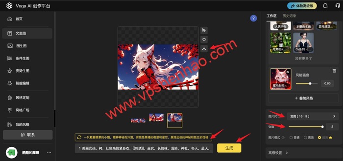 按图点击菜单栏,上传AI绘画原始图片,选择模型类型,选择风格样式,选择图片尺寸,选择图片生成张数,填写AI绘画提示词,点击生成按钮就能生成图片了