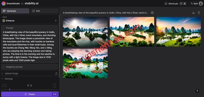 将文字放到Prompt文本框,可以选择生成图片张数,默认是4张,可以选择生成图片的比例,选择了3:2,文字里的image size没有发挥作用,应该是按系统的比例生成的,点击Dream生成了四幅山水画,好看的