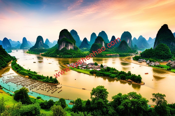 ”A breathtaking view of the beautiful scenery in Guilin, China, with the Li River, karst mountains, and stunning landscapes. The image shows a panoramic view of the mountains and the river, with tourists on bamboo rafts and local fishermen in their small boats. Among the tourists are Zhang Wei, Wang Yan, and Li Ming, who are enjoying the stunning scenery and taking photos. The time is in the morning and the weather is sunny with a light breeze. The image size is 1500 pixels wide and 1000 pixels high.”