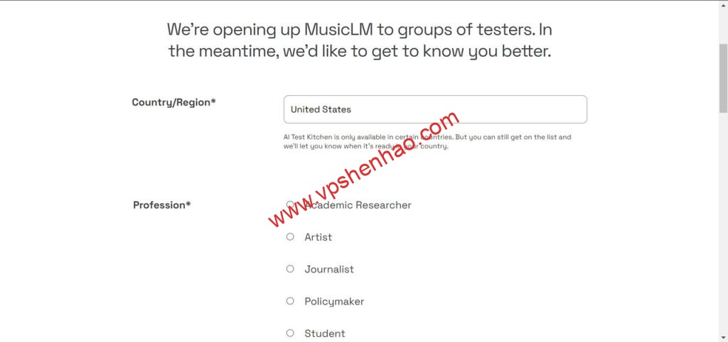 选择国家,职业,想要测试AI音乐工具的理由等,点击用Google注册,